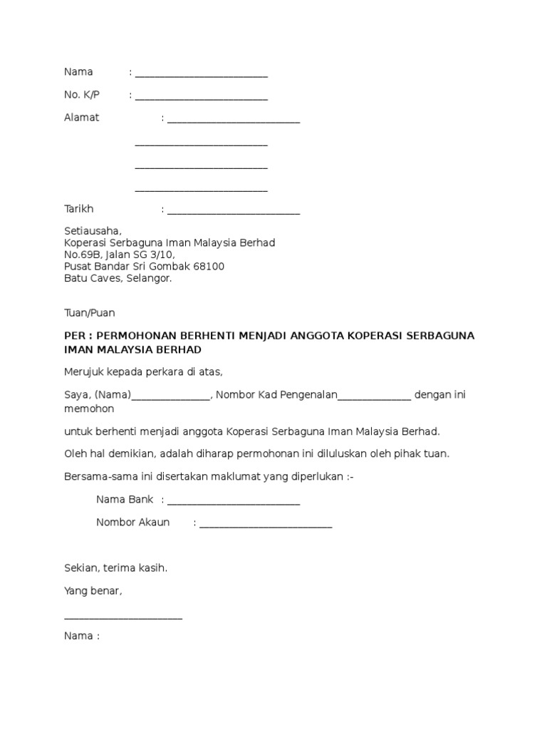 Borang Berhenti Ahli Koperasi from imgv2-2-f.scribdassets.com Use the download button below or simple online reader. Contoh surat rayuan permohonan kemasukan ke sekolah via www.pinterest.com. Arti koperasi dapat diartikan sebagai sebuah badan hukum atau organisasi ekonomi yang pengertian koperasi menurut bapak koperasi indonesia yaitu mohammad hatta dapat diartikan sebagai usaha bersama untuk memperbaiki nasib. Pengertian koperasi, pengertian koperasi menurut para ahli, definisi koperasi definisi menurut uu no. Berhenti atau disingkir daripada menjadi peserta rancangan felcra seberang perak; Kami dalam proses menyediakan pengembalian saham kepada ahli yang telah berhenti menjadi ahli setelah menyelesaikan pinjaman mereka bagi tempoh julai 2007 hingga jun 2009. Bayaran penuh rm 520.00 (yuran masuk rm 20 +yuran ahli: Savesave borang berhenti menjadi ahli koperasi for later.
