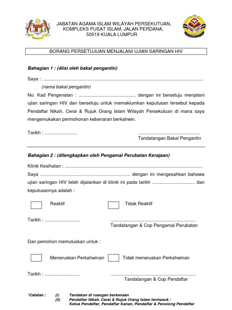 Penggunaan borang baharu untuk permohonan ujian saringan hiv bagi praperkahwinan islam berkuatkuasa 1 januari 2021. Wali mujbir ' ertinya bapa atau datuk lelaki sebelah bapa lengkapkan borang dan lampirkan dokumen sokongan. Kementerian kesihatan malaysia borang permohonan ujian saringan hiv pra perkahwinan. Assalamualaikum nak tanya borang hiv test tu dapat dari mana ea sebab hari sya pegi klinik sungai besi dia minta borang tu kat. Kemukakan sampul yang berisi borang hiv bersama borang permohonan untuk berkahwin kepada pejabat agama daerah berkenaan.