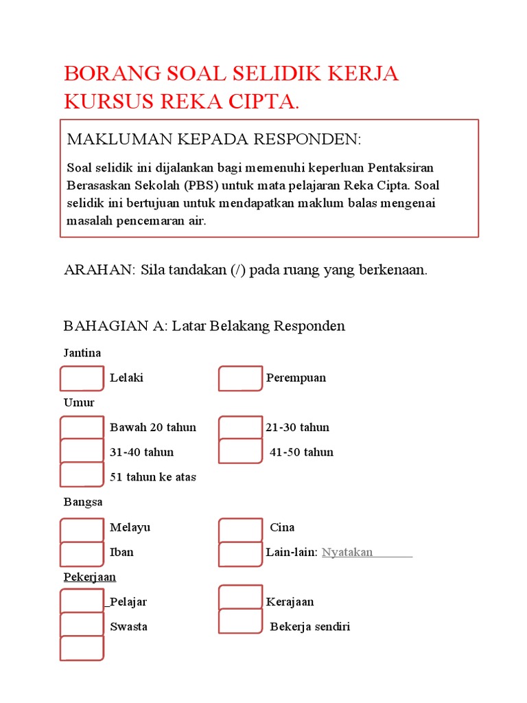 Contoh Borang Soal Selidik Reka Cipta / CONTOH BORANG-SOAL-SELIDIK / Manual perolehan perunding 2006 via www.slideshare.net.. Respon pelajar terhadap pengajaran guru bahagian a: Temu bualtemu bual ialah pertemuan dengan seseorang untuk bersoal jawab atau menyoal untuk mendapatkan berita dan sebagainya. Aspek :1.2 membuat penyelidikan dan penyiasatan berhubung dengan reka ciptaan yang merupakan penyelesaian kepada masalah yang telah dikenal pasti. Borang soal selidik pengakutan guru (lampiran d) kaji sek senarai semak kemudahan dan prasarana pk 07 3 contoh format minit mesyuarat. Perkongsian cara membina jadual kerja untuk proses kerja lapangan mengikut masa yang ditetapkan iaitu selama dua minggu.